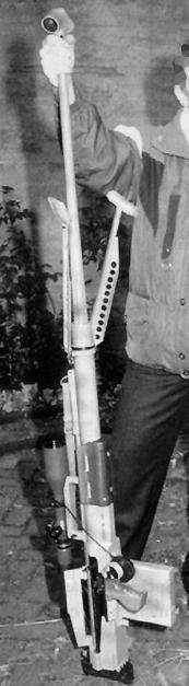 The culumnation of such rifles is without a doubt the Hungarian made Technika Magnum 96 Destroyer. This monster of a weapon is over six foot long, has a barrel five foot long, is a semi-automatic, fires a cartridge which has one and a half times the muzzle energy of a .50 BMG, and is capable of penetrating a inch of steel at the astounding distance of 1 kilometer! Suffice to say that the Magnum 96 has to be (and is) a BIG weapon. The next cartridge type available is 20 mm, and those are cannon shells.