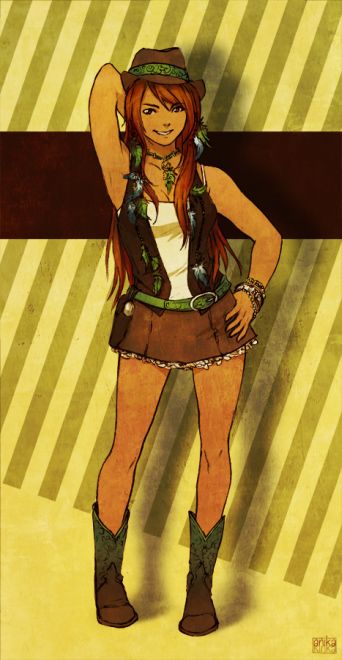 She does not usually wear traditional styles of Tribal dress although does like to combine elements of it into her clothing. She will often wear a vest with feathers sewn into it along with native type designs. She usually wears several Native style bracelets and a choker collar. Usually she wears a belt which matches the jewelry in basic style. She usually also wears a few rings. Finally, usually she wears simple cowboy boots and a cowboy style hat with a decorated band. Only when she absolutely needs it does she wear the full body armor but usually when on the trail will at least wear the armor jacket.