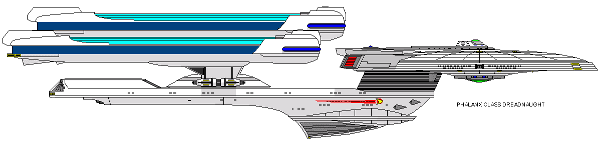 As time went on, the Excelsior class replaced the Constitution class starship as the backbone of the Federation. They were tough vessels and served in virtually all roles within the Federation. It was natural that the Excelsior class would be considered as the basis for a new Dreadnought class. The Federation and Ascension class dreadnought were getting old and had been either scrapped or put into mothballs. Tensions between the Federation and the Romulan Empire were high at the time the Phalanx class was authorized and it was felt that the Federation needed a more powerful combatant vessel.